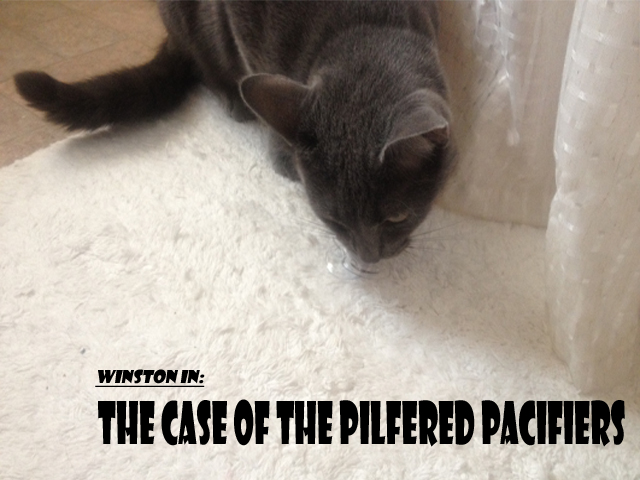 However, one morning, I awoke to hear some weird noises, like something being pulled across the floor. I followed the sound into the baby’s room, where I found, not our human baby, but our feline baby, Winston, looking up at me, with the pacifier in his mouth as if he were Maggie Simpson.