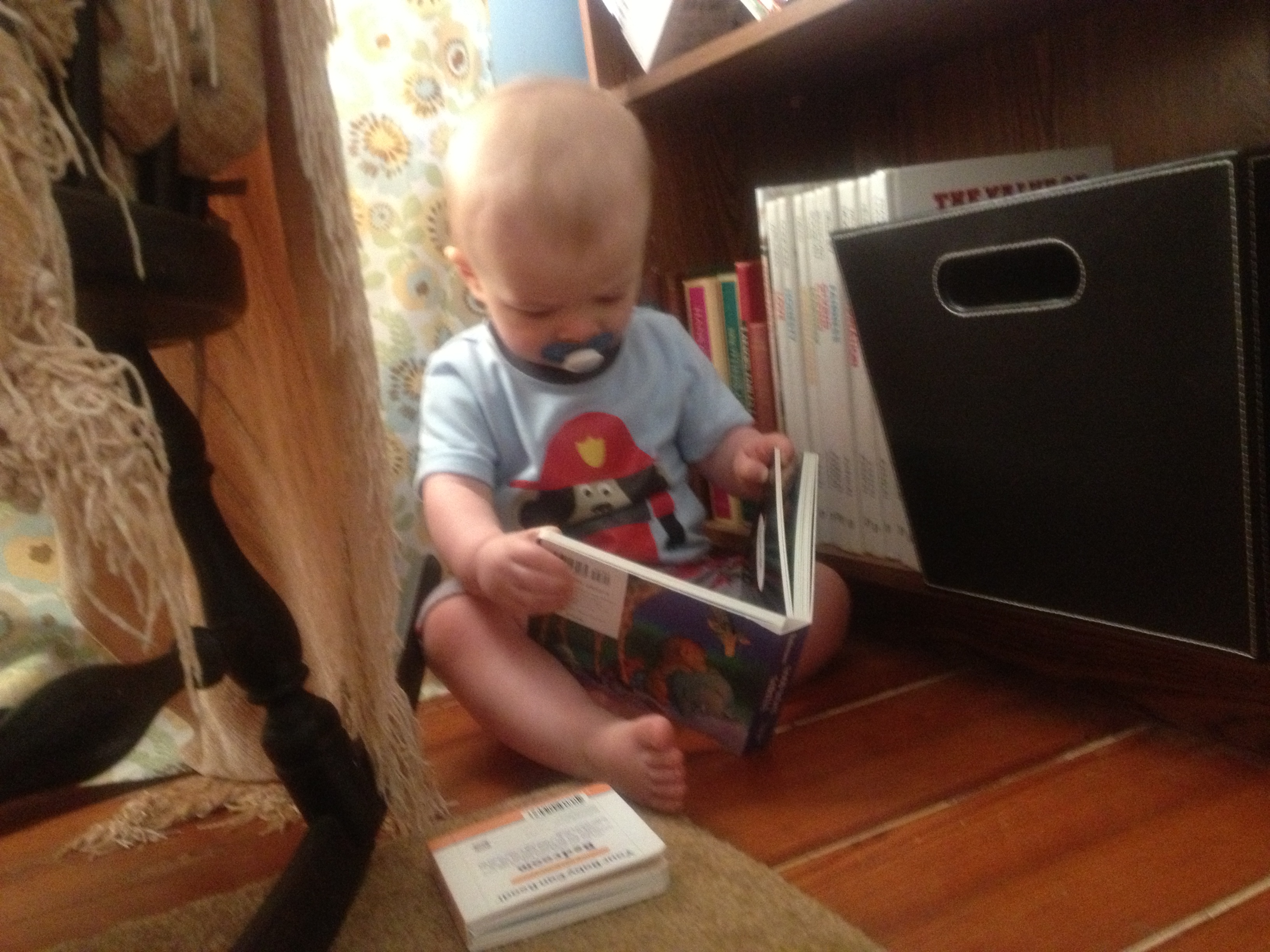 Lately, though, I have been especially curious when it comes to the look on our little guy’s face as he flips through books. I know I write a lot about (perhaps ad nauseam) how important our nightly routine of story time is, but I think it must have had some kind of effect, because now the little one year old monkey will spend time during the day, just pulling books off the shelf in his room, or out of his play basket in the living room.