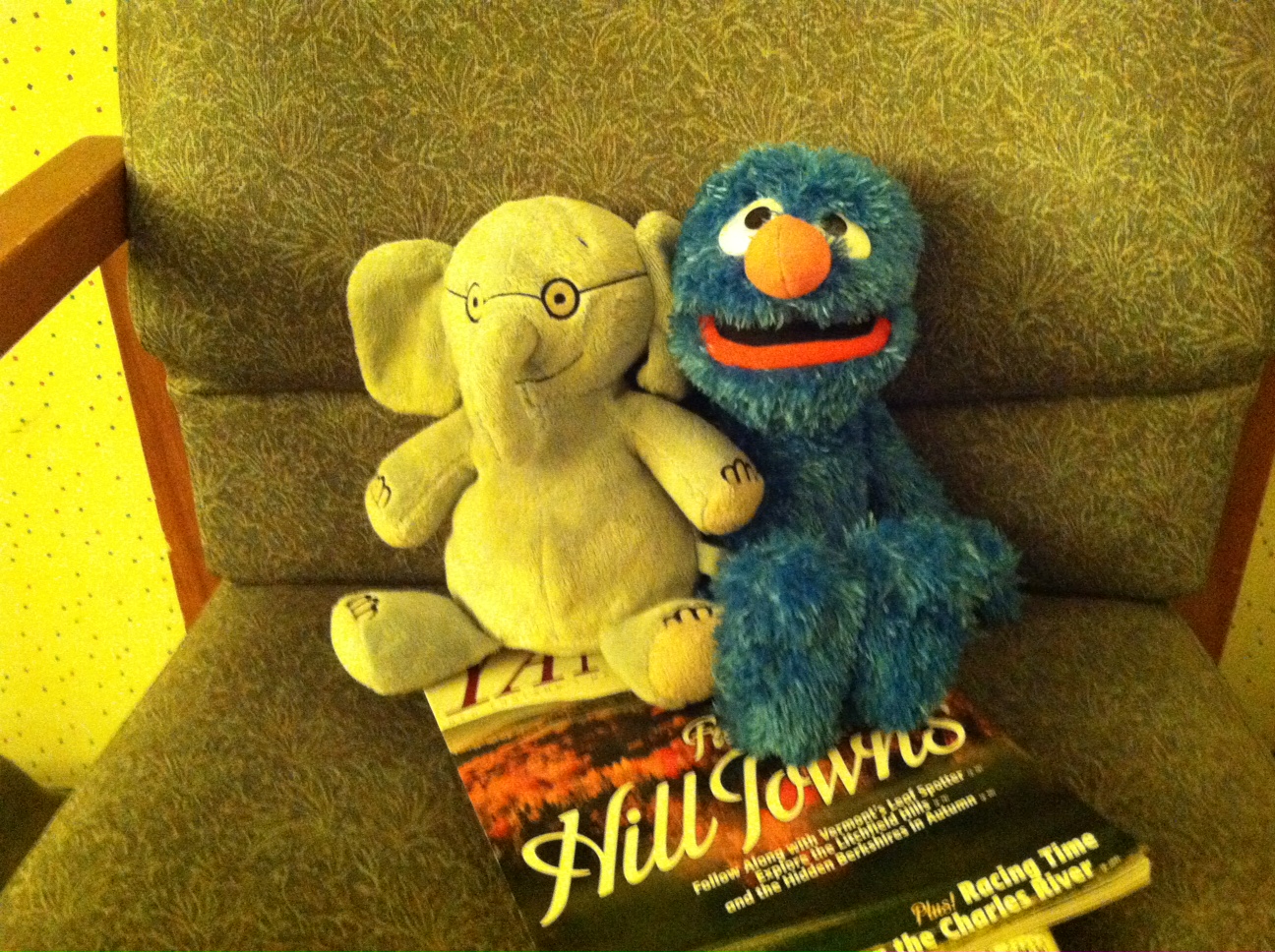 I made a trip home in the night and returned with some familiar friends for our guy – Gerald the Elephant, and Pigeon, hoping that having a familiar face might help him feel more comfortable. In the morning, Gerald and Pigeon made a new friend – Grover, who joined us from the hospital gift shop on my trip down there for something of comfort, and to find Meg a magazine to read. My parents showed up at one point, bringing with them a talking Daniel Tiger doll that once he was awake, the little guy played with again and again in the cage-like crib set up in the hospital room. It’s set up so that they can’t get out in the night, but looks as though they’re an animal in the zoo.