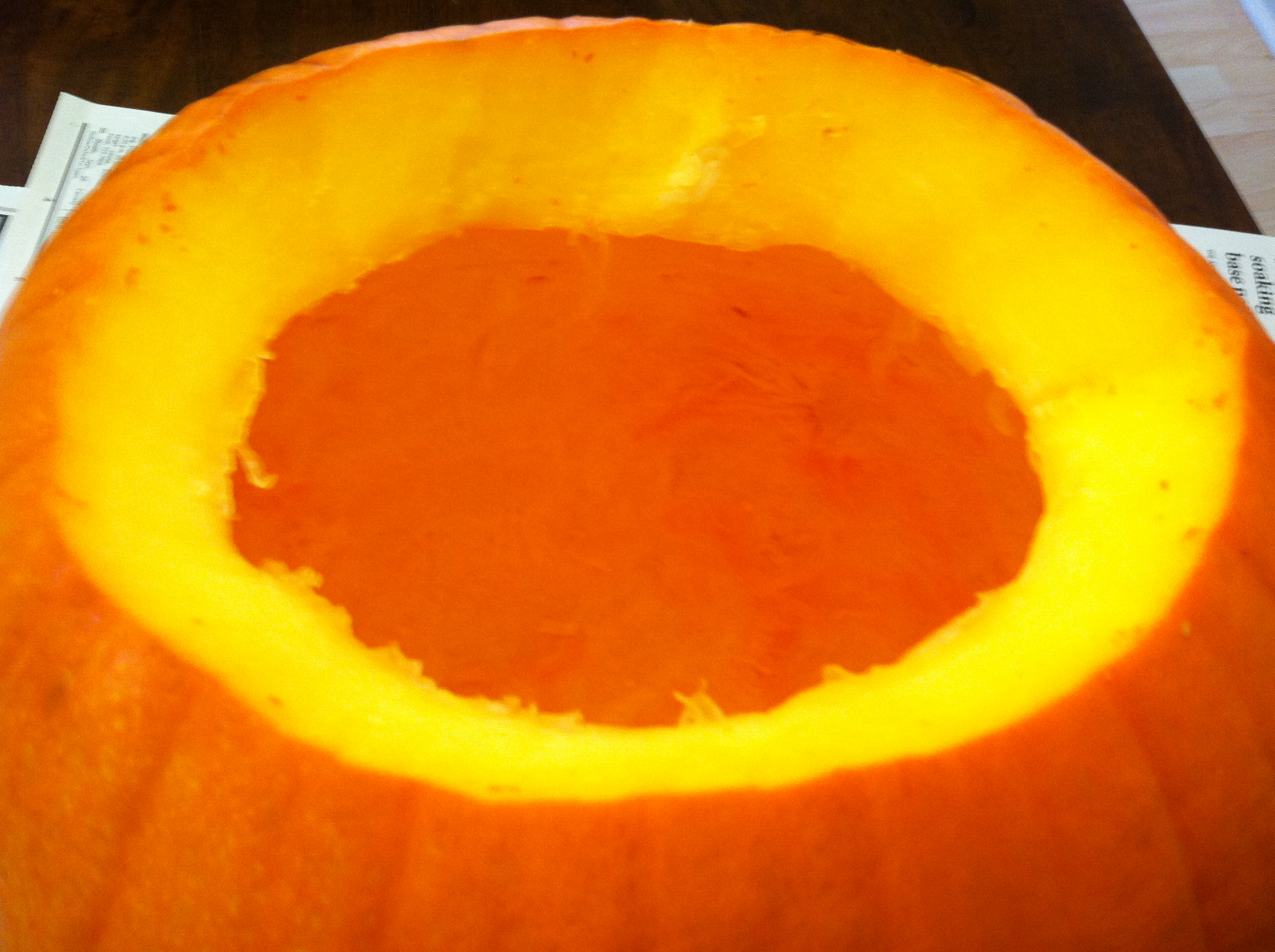Then, using the carving knife and an ice cream scoops, I gutted all of those seeds and pumpkin-innards until we were left with one big, hollow pumpkin.