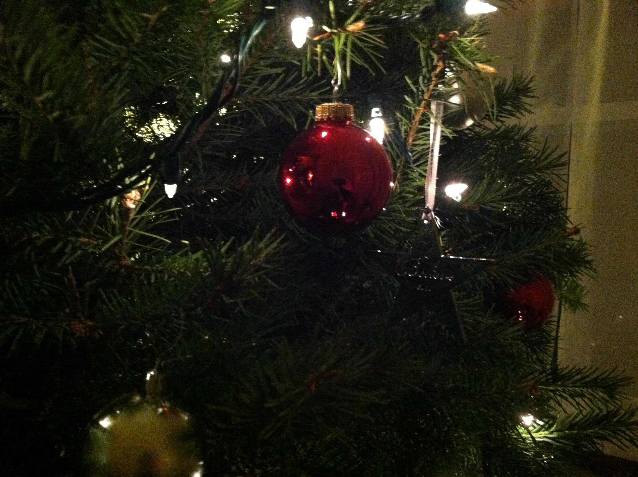 This went on for about 45 minutes as we each tried our best to figure out just how to get this tree to stop falling down on us, even though it was screwed into the stand. Meanwhile, the sounds from upstairs indicated the little guy had no intention of going to sleep that afternoon and was not in a happy mood.