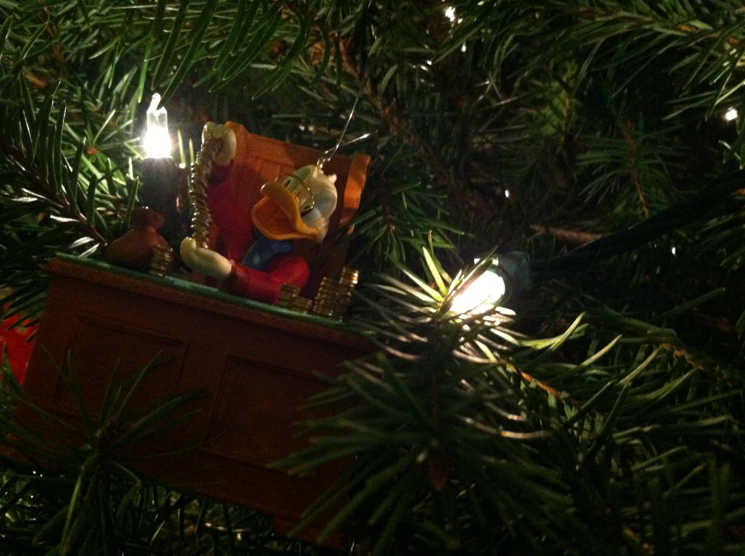 With that, we were okay to bring the little guy downstairs (free of a falling-tree zone) and continue decorating with his occasional assistance. Upon our tree was a veritable memory book of our lives so far, from the Macy’s Elf Meg and I picked up on one of our several pre-parenthood trips to New York City, to the Scrooge McDuck as Ebeneezer Scrooge ornament that reminds me of my childhood love of the character, one that seems to have, inadvertently been picked up by our son.